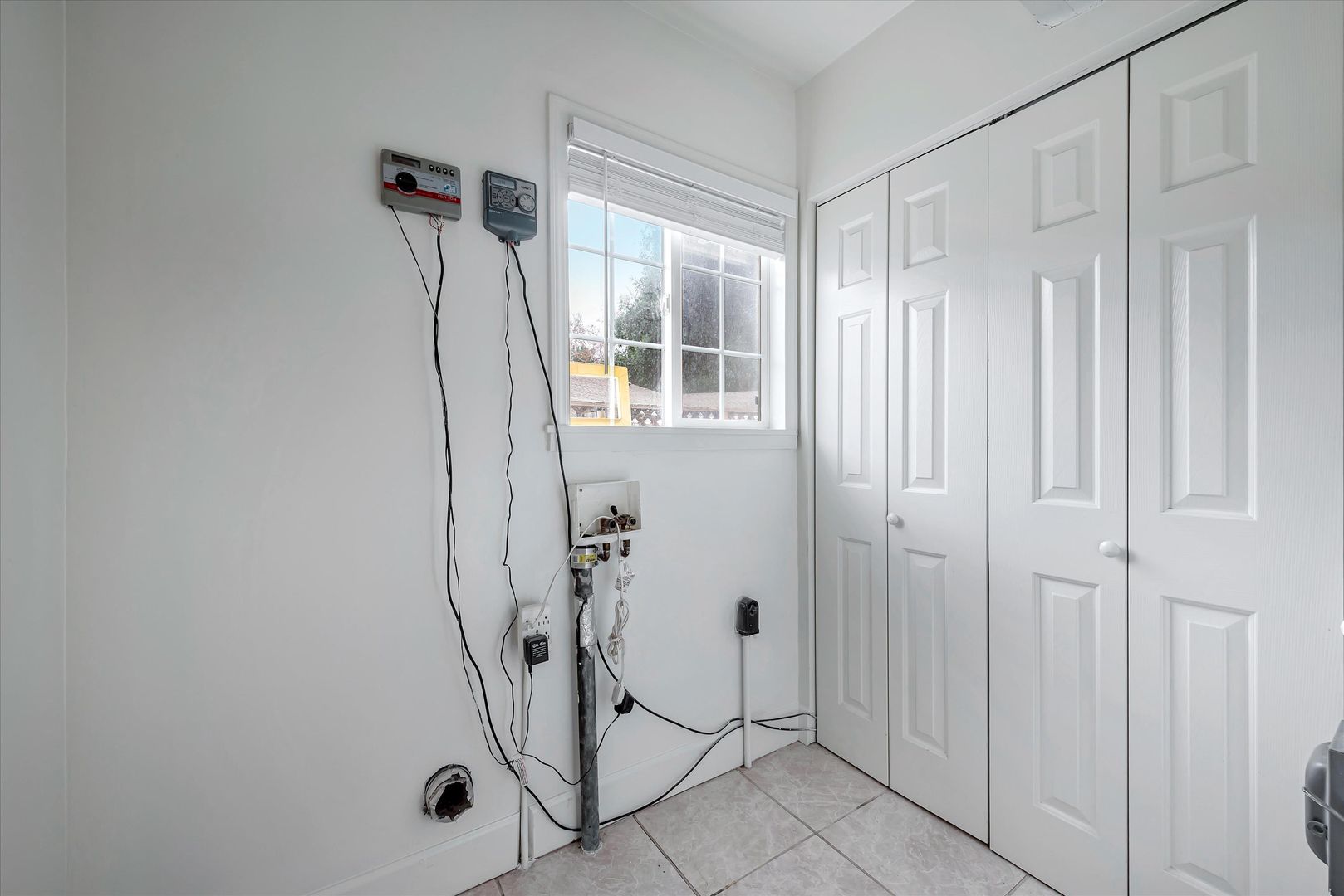 Indoor laundry room with washer and dryer hook-ups