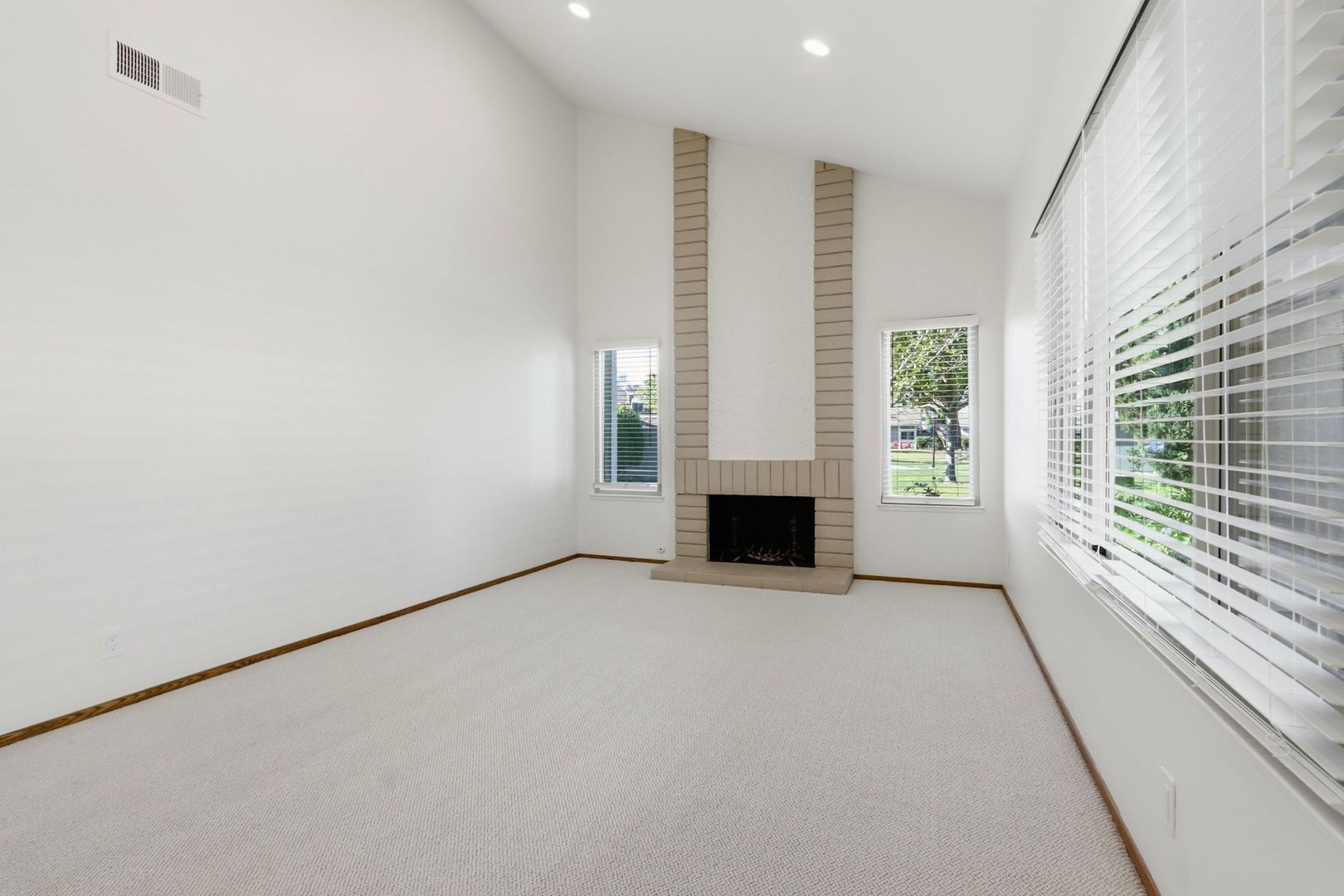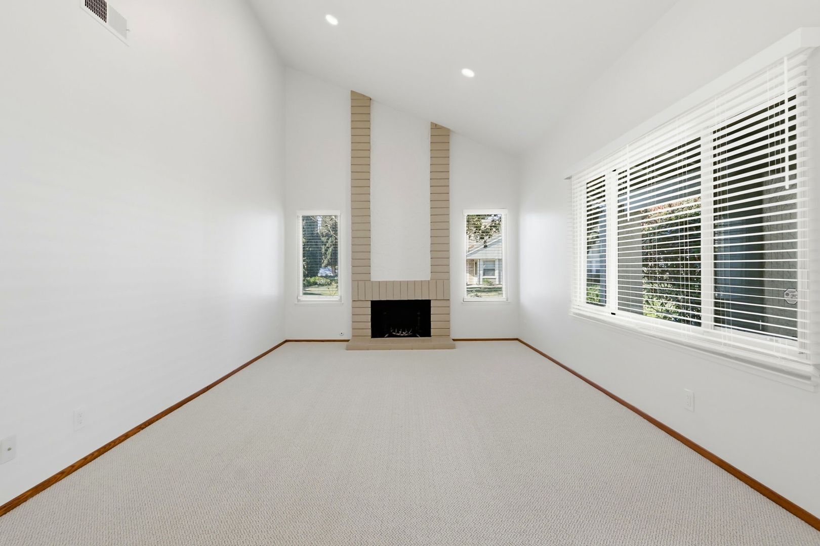 Living room with new carpet and fireplace (not for use)