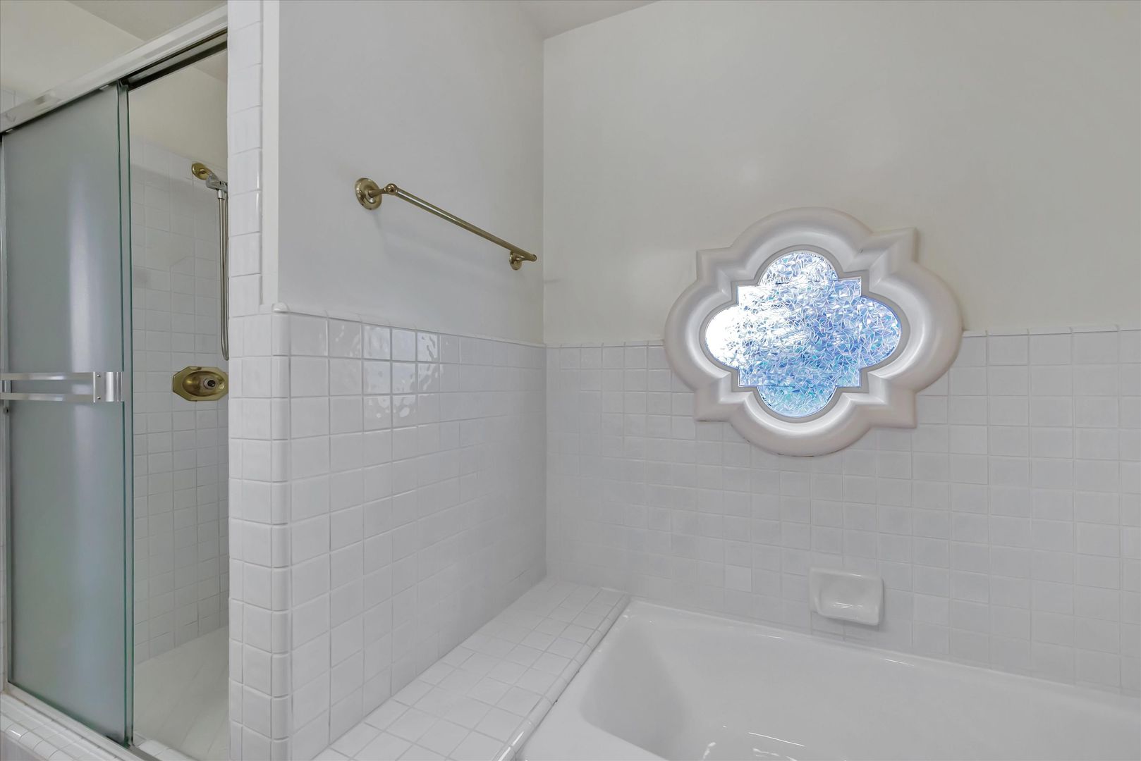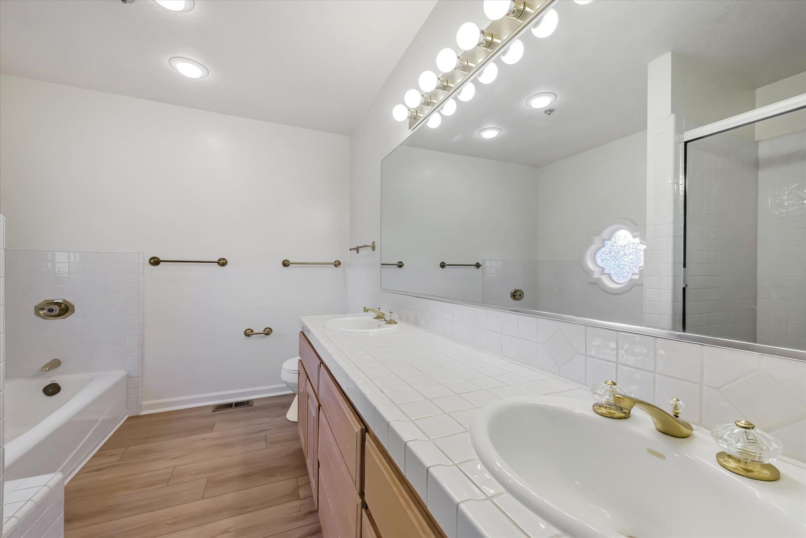 Primary bathroom has a separate tub and dual sinks