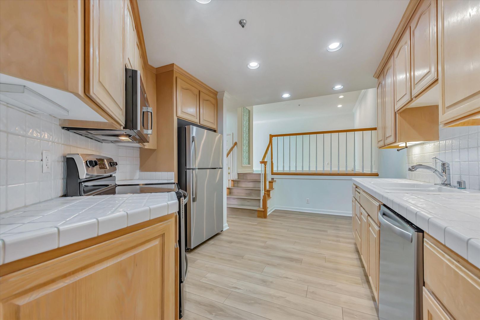 Kitchen with refrigerator, stainless steel range, microwave, dishwasher and plenty of cabinets and counter space